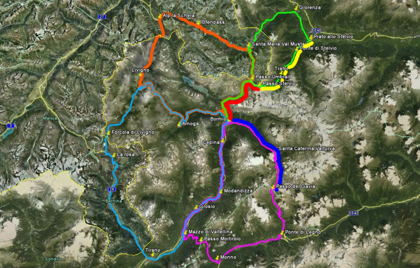 | Thanks to Google Earth, here's an overview map of our Bormio based road bike rides. |