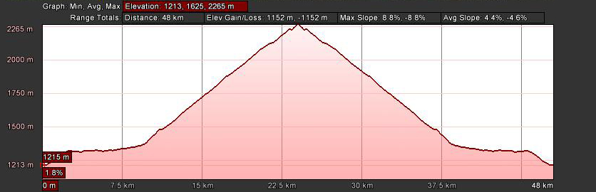 Foscagno Pass Out and Back Road Bike Ride Profile: 48.0 Km/29 miles with 1152 meters/3790 feet of climbing.