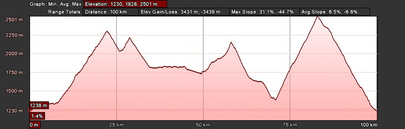 Ofenpass Loop Road Bike Ride Profile: 100.0 Km/62 miles with 3431 meters/11287 feet of climbing.