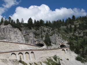 Ridden counter-clockwise from our Cortina hotel, on this lollypop shaped route we'll climb out of Cortina (1225m) on the famous "Strada delle Dolomiti" (SS 48)—first through the huge meadows surrounding Cortina is this wide valley, then through the evergreen forests as we climb higher—with the soaring Tofana group to the north throughout our gradual climb to Passo Falzarego (2105m).