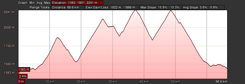 Descending from Passo Sella toward Canazei we once again bypass entering town and turn left at the junction with SS 48 (1825m), limiting our descent to 385 meters. Our last climb of the day is 414 meters to Passo Pordoi (2239m), and winds through the ski runs above Canazei.